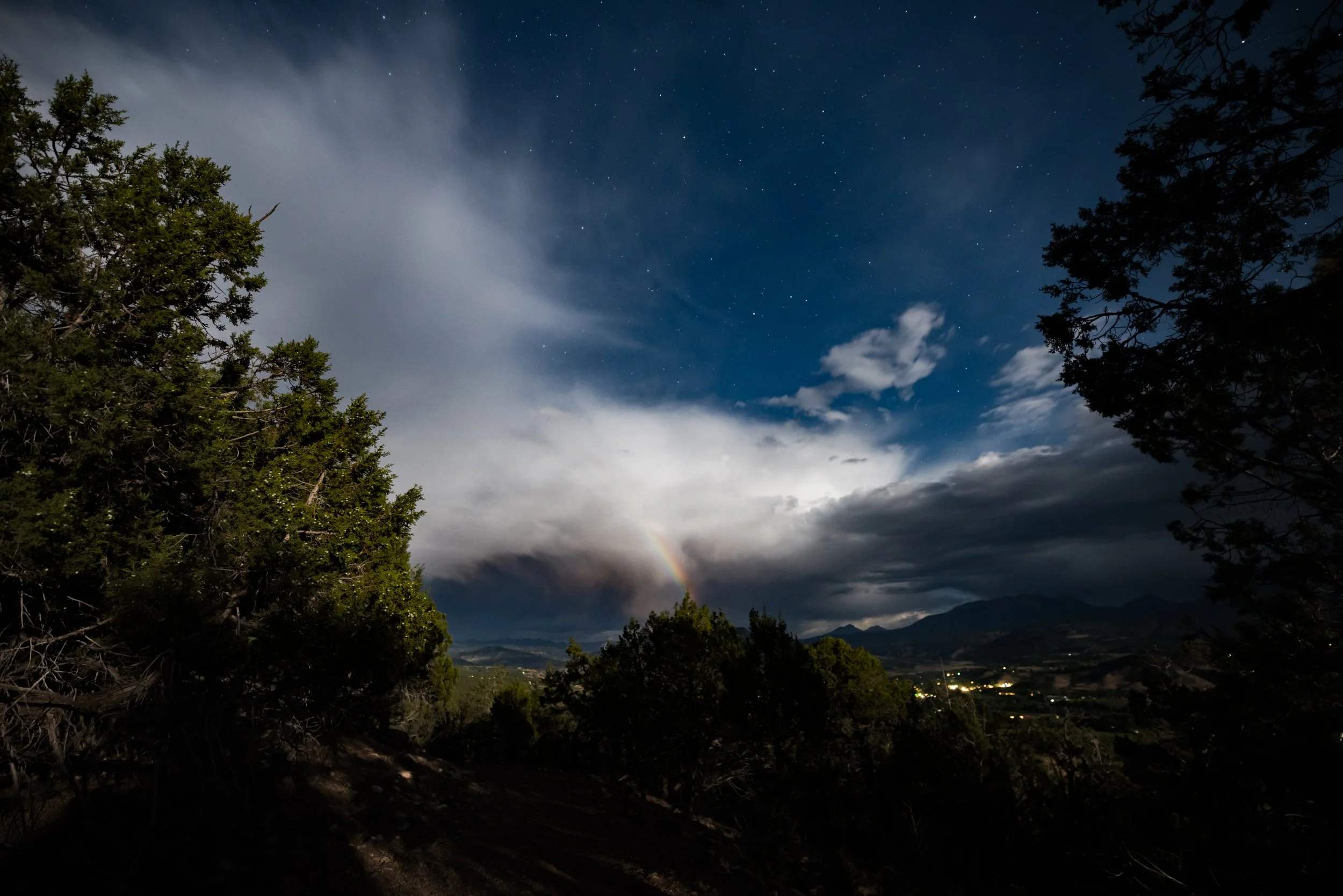The Thunder Moon living up to its name. A few waves of thunderstorms rolled through in the early morning last night. After awhile, the bright moon appeared low in the southwest, and I went out to look for moonbows. Sure enough, I was delighted to see the telltale faint white arc in the distance towards the east. There was a hint of color visible to the unaided eye, and it lasted for about 5 minutes before fading.