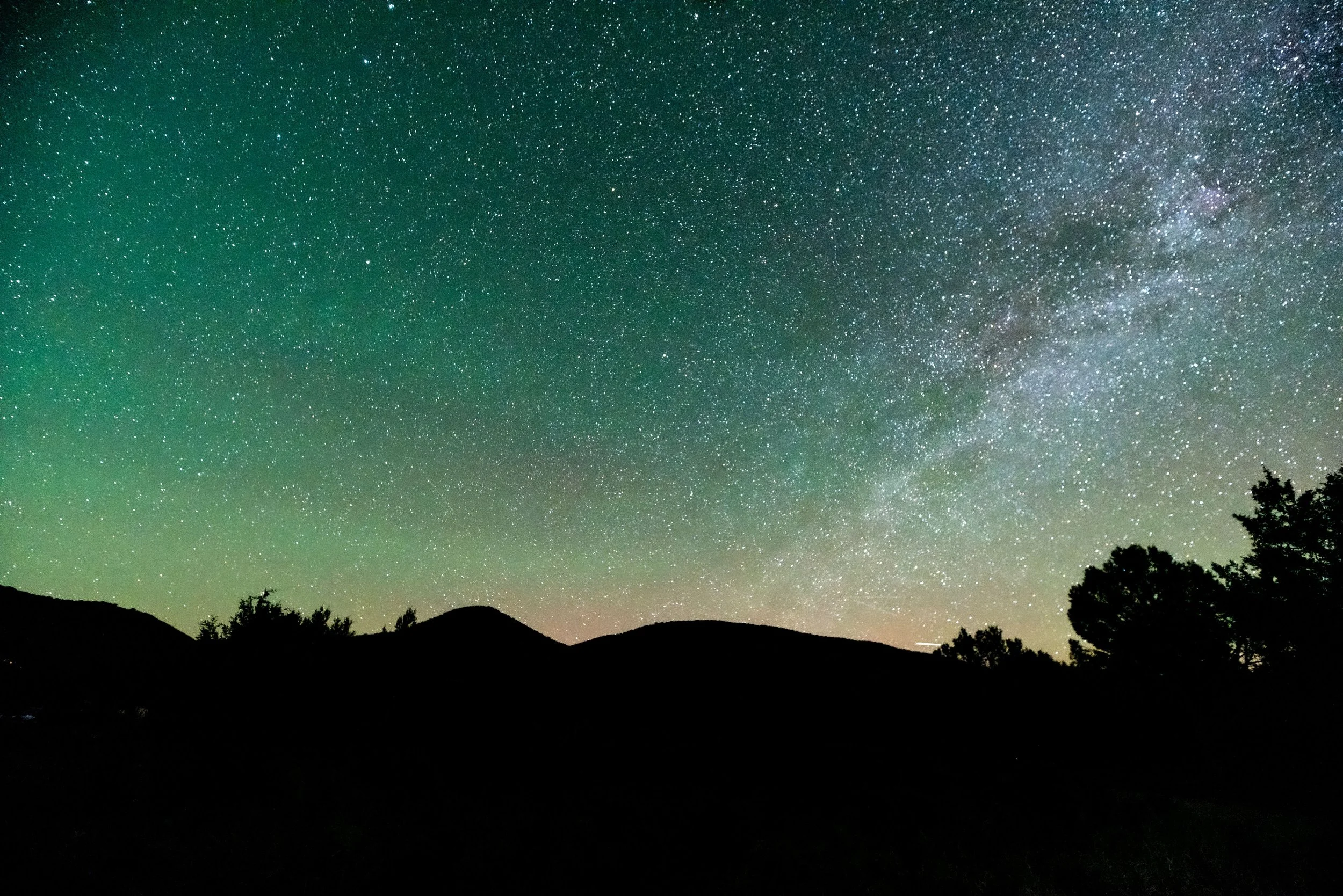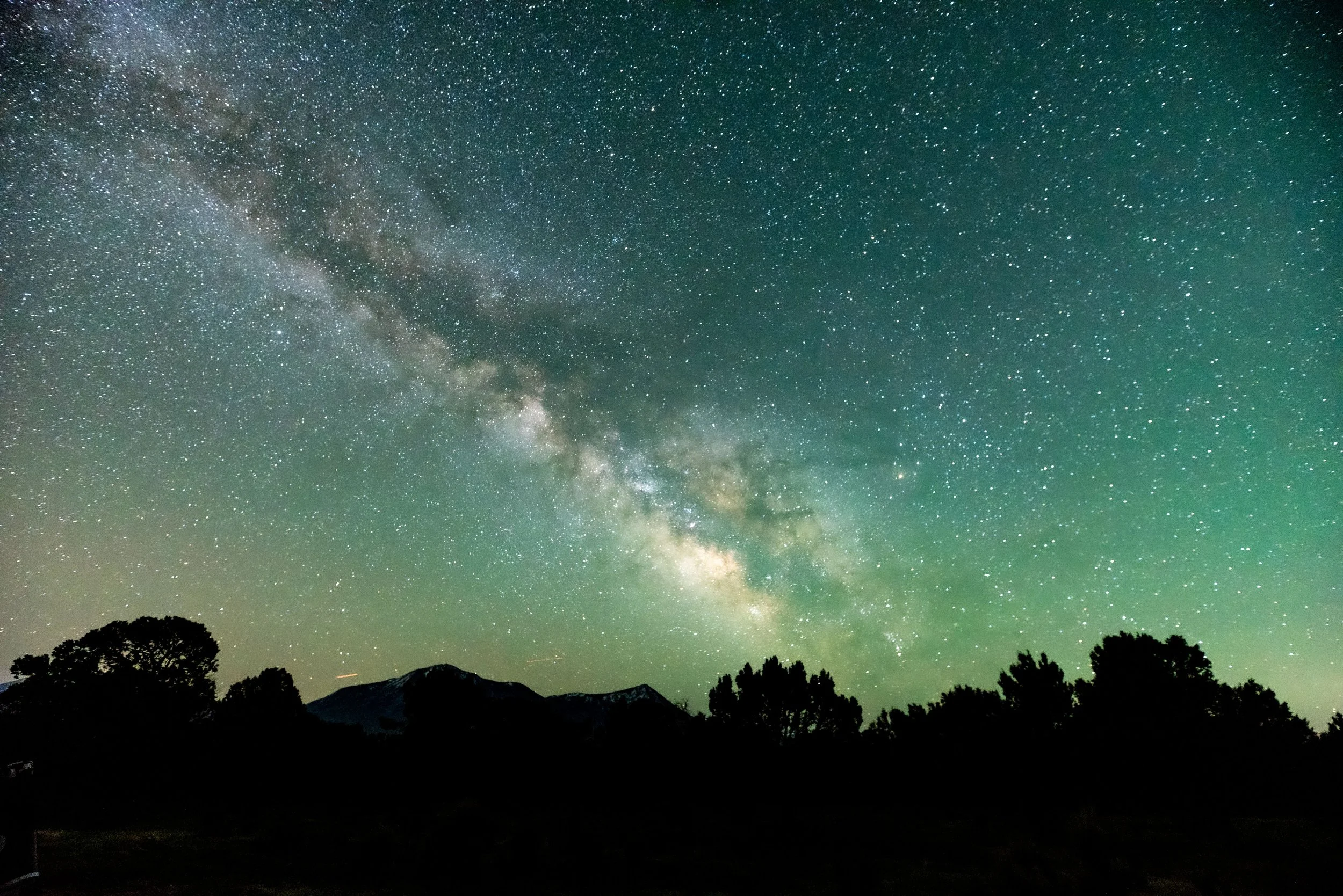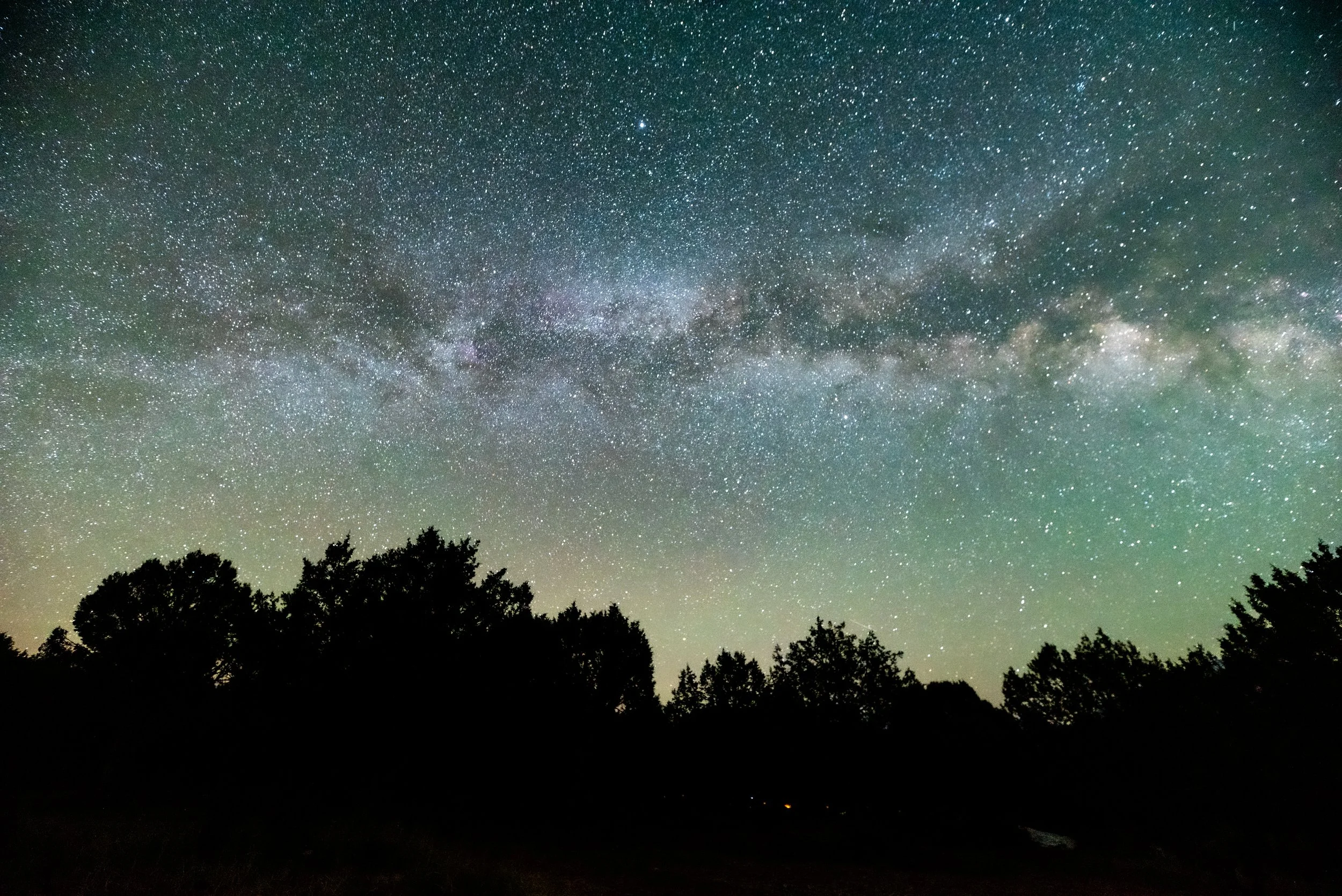 I woke up after the moon set around 1 am local time (7:00 UTC) on May 2, 2025. The sky was crystal clear but seemed bright, so much so that it was harder to see the faint fuzzies in the telescope than the night before. Long exposure photos revealed a green glow. Using the fish eye lens showed that the green glow was more pronounced around the horizons. I did not notice much in the way of ripples or movement in the glow. Also of note, there was a minor geomagnetic storm (kp=5) earlier in the night, and auroras were reported across the globe under moonlit skies. Nikon D750, 20 seconds, iso 6400, 14mm and fisheye lenses.