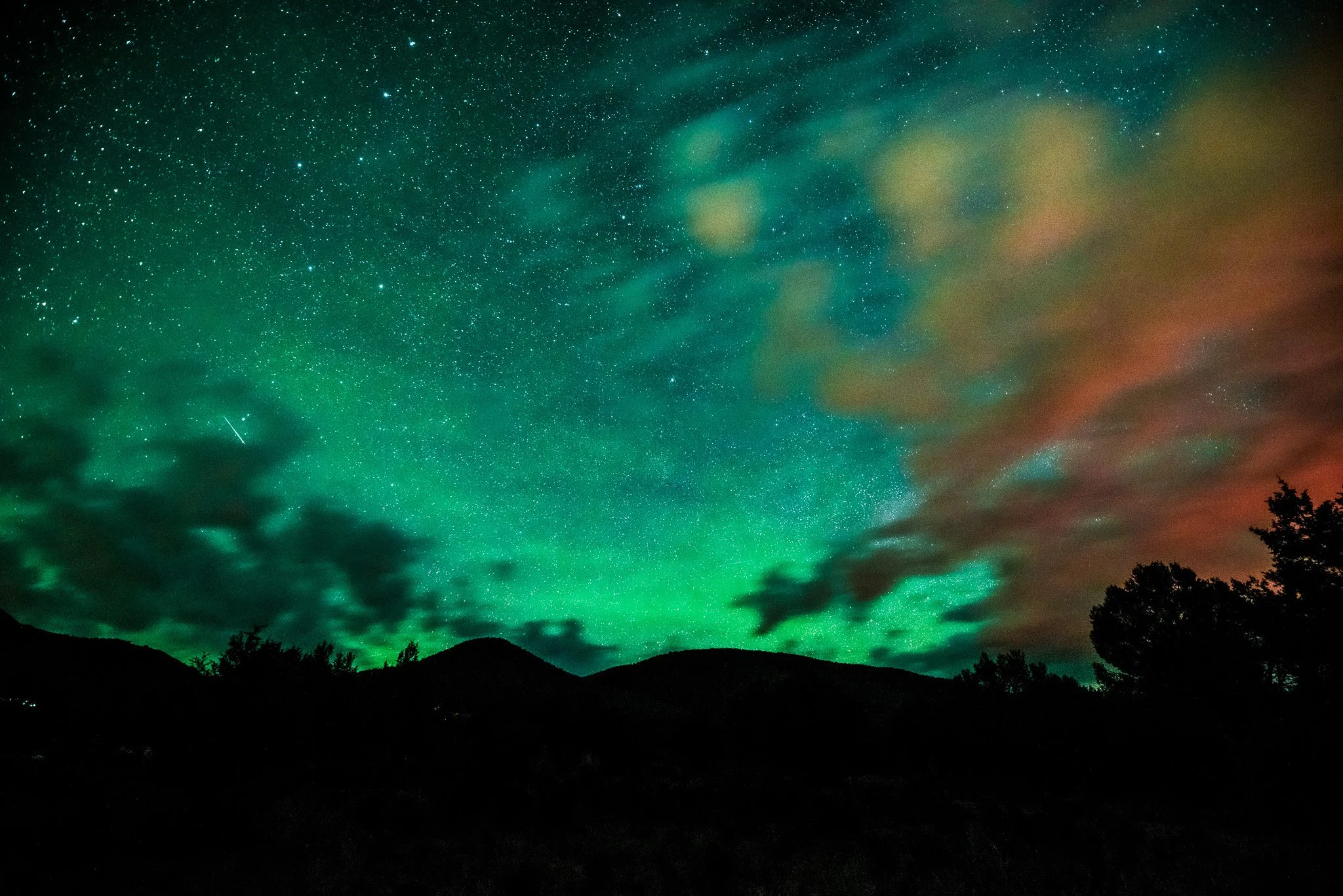 I woke up around 1 am Mountain time to partly cloudy skies. I could tell there was something going on to the north, but the clouds and light pollution made it hard to figure out what glow was what. I did some observing of deep sky objects through the telescope, but the glow to the north kept catching my eye. Finally I set up a time lapse to see what was going on, and there was the bright green glow. It was easily visible to the unaided eye behind the clouds. It was challenging to try to tease out the difference in color and texture of the glow with just my eyes.