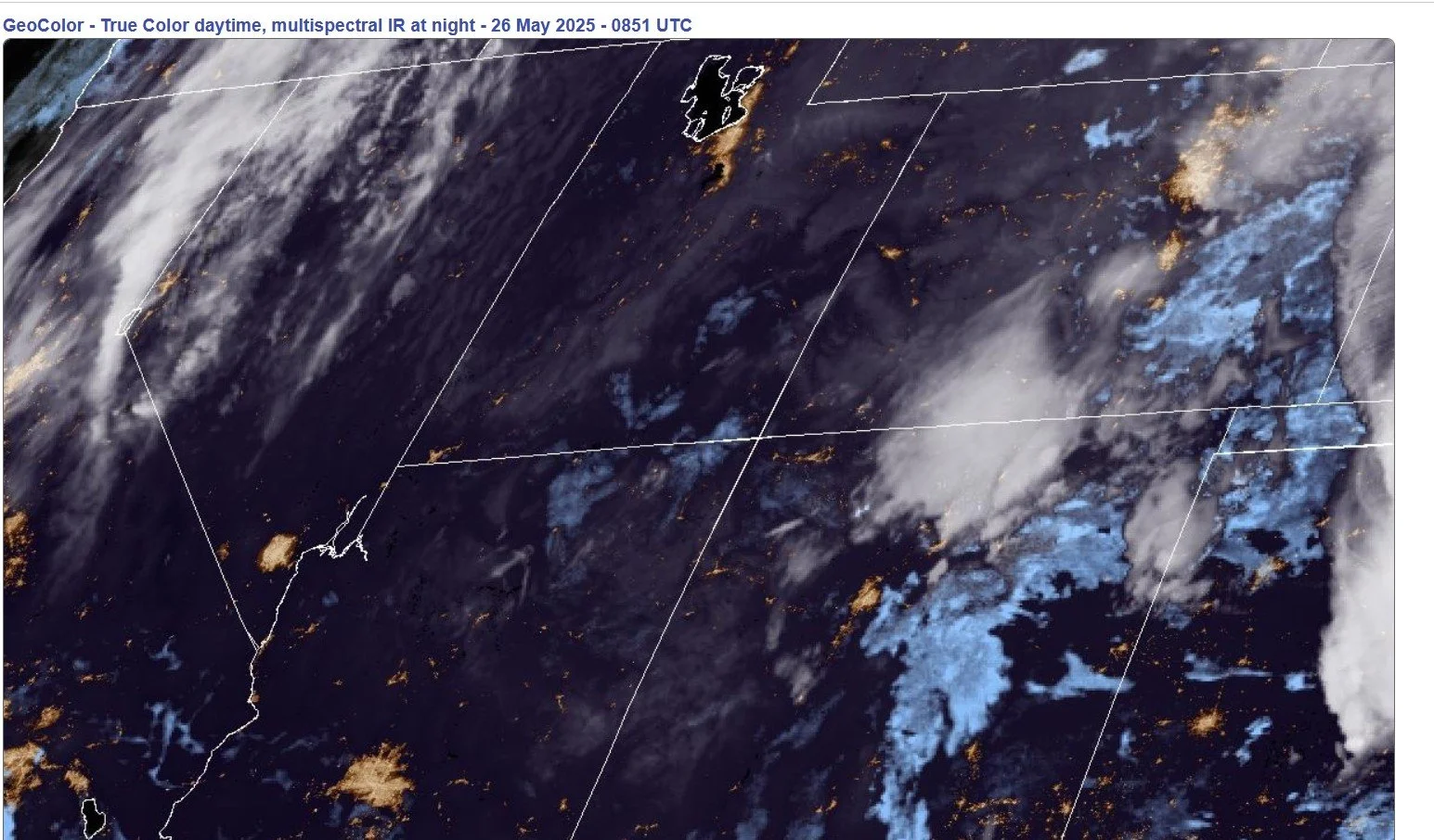 THE SKY cleared up after midnight and it was very pleasant with the Milky Way rising over head. I saw flashes of lighting from a thunderstorm complex to the south. See the screenshot below showing NOAA-GOES satellite imagery from just before 3 am local time (9:00 UTC). At around 3:30 am, I ran a timelapse sequence for about 30 minutes and picked up some watery-green airglow rippling across the sky. North is down in this image set, so the ripples were flowing from south to north, as if flowing out from above the storms to the south. The ripples were invisible to the unaided eye, though the sky looked somewhat bright, especially along the horizons. SQM readings were around 21.4, which is about 0.2 mpsas brighter than I would expect on a clear night at that time. Nikon D750 at 20 sec 6400 iso f2.8.